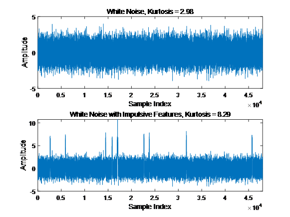 這樣服從正態(tài)分布的數(shù)據(jù)的峰度值為0,因為正態(tài)分布的四階中心矩與方差平方的比值恰好等于3。簡單來說,峰度可以用來描述信號的非平穩(wěn)特性,尤其是短時間內(nèi)突發(fā)的噪聲干擾,如果一段數(shù)據(jù)的峰度值越大,則表明該段數(shù)據(jù)中含有的突發(fā)性噪聲干擾成分較多。下面以一段數(shù)據(jù)分析對比為例,采用信號仿真方法生成一組隨機白噪聲信號和一組添加有突發(fā)性沖擊干擾的白噪聲信號,分別計算兩組信號的峰度值可以發(fā)現(xiàn),含有突發(fā)性沖擊特征干擾的白噪聲信號的峰度值為8.29,明顯大于不含有干擾的白噪聲信號2.98。
